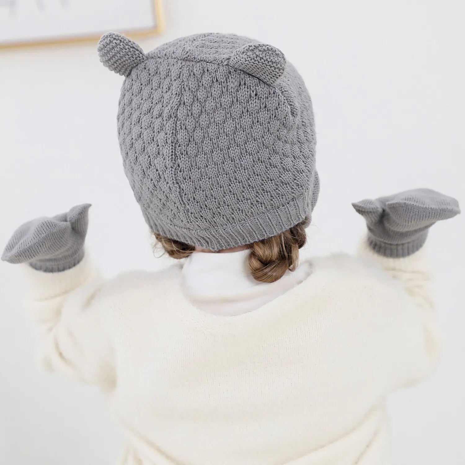 2Pcs Baby Knit Gloves Hat Set Solid Color Autumn Winter Ear Protection