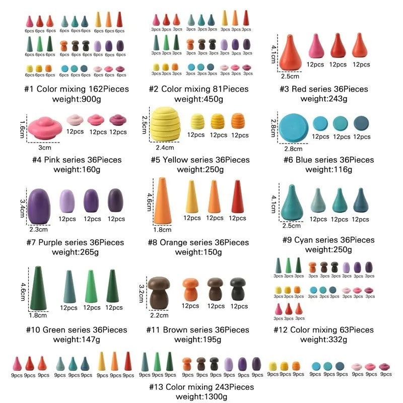 There are 9 different shapes of loose wood grapes, including mushrooms, small honeycombs and other interesting shapes. Our grapes are available in 27 different colors in bulk. The diversified design makes children more creative. modeling.